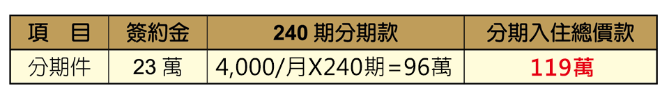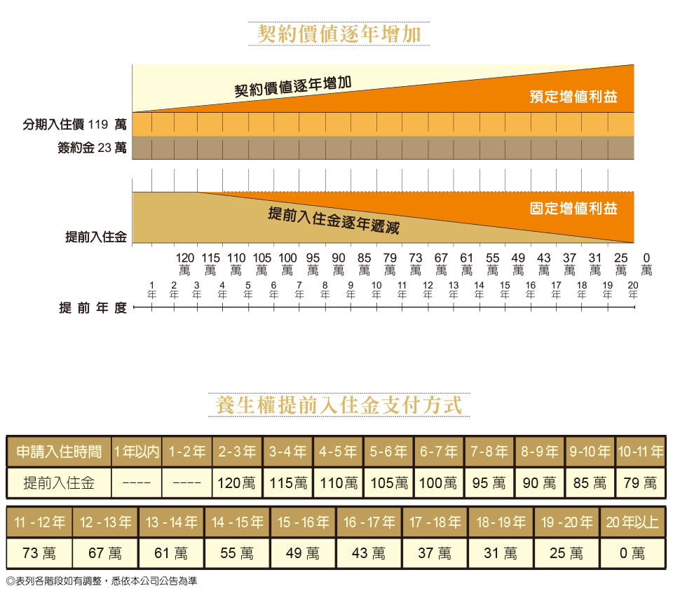 會員價119萬元,即可擁有一份完整的退休生活保障。使用「生活護照」所繳價金可以全額折抵「養生權契約」並享 20 年無息分期及提前入住金逐年遞減之優惠。