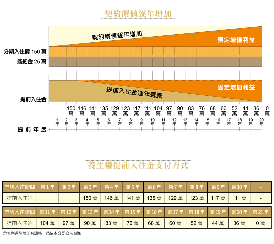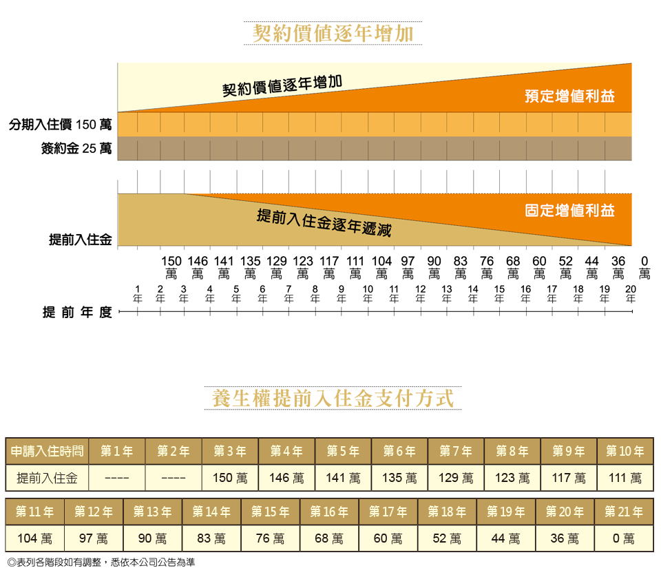 按入住時間計算費用,只要預付簽約金,即可擁有養生權契約,而且不限年齡,可任意轉讓,是一份可以兼具投資理財的有價契約。