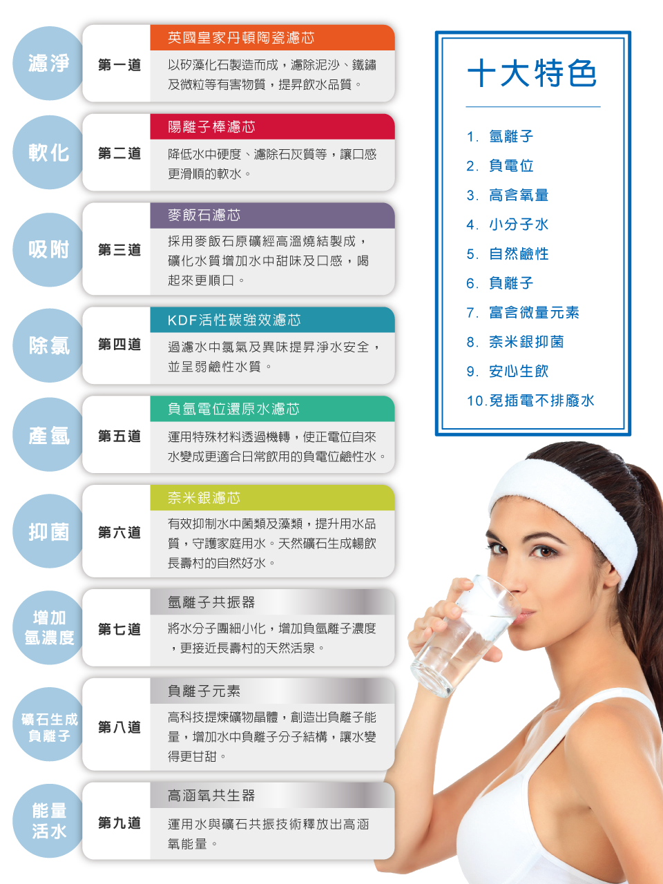 專業過濾工法:濾淨→軟化→吸附→除氯→產氫→抑菌
