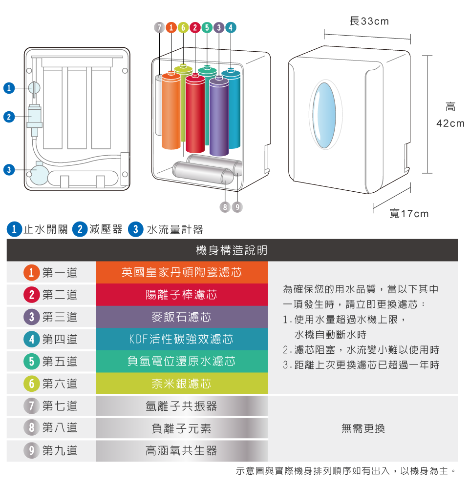 3-本水機使用時請注意用水量限制,若有洗菜、洗水果的需求,建議蔬果在使用自來水清洗後,再使用水機的水裝小盆浸泡即可,勿以水機的水連續大量沖洗,以免浪費負氫離子水,也會加速濾芯的更換時間。
