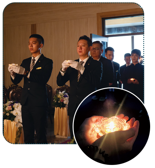 首創「獻燈儀軌」,為往生者獻上一盞明燈,接引佛國,無諸苦惱但受諸樂;為自身獻上一盞心燈,祈盼未來心靈安詳,順遂圓滿所得福聚,創造出有溫度、有感情的告別儀式。